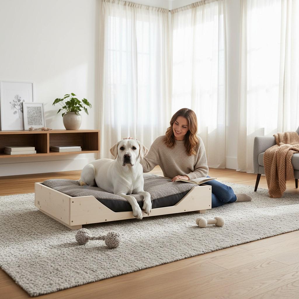 Description: This wooden dog bed is a sleeping place and living accessory of a very special kind. Made of solid Nordic pine wood - with a lot of love directly from a small carpentry shop in northern Germany. Optically beautiful shape and the integrated entry underline the uniqueness of this dog bed. The entry allows even older dogs to go to bed effortlessly. As an addition, there are screwed-on felt gliders under each dog bed. In this way, any wobbling and chafing on the floor can be avoided. Not convinced yet? Here are the details: - Dog bed / dog sofa / dog basket made of wood in the popular color nature- Can also be used as a cat bed - Material: pine wood - Dimensions in cm: 60 - 110 cm wide - Height in cm: 19-20 - Inner dimensions: length and width each approx. 5 cm less | Height approx. 12 cm - including felt gliders - each piece is unique Please note: Wood is a natural product and each part is unique. Slight color deviations, small knotholes, warpage, splinters, dimensional inaccuracy, gaps, cracks or signs of use are not a quality defect. They underline the authenticity of the material. Please note that colors and brightness may differ from the respective picture.