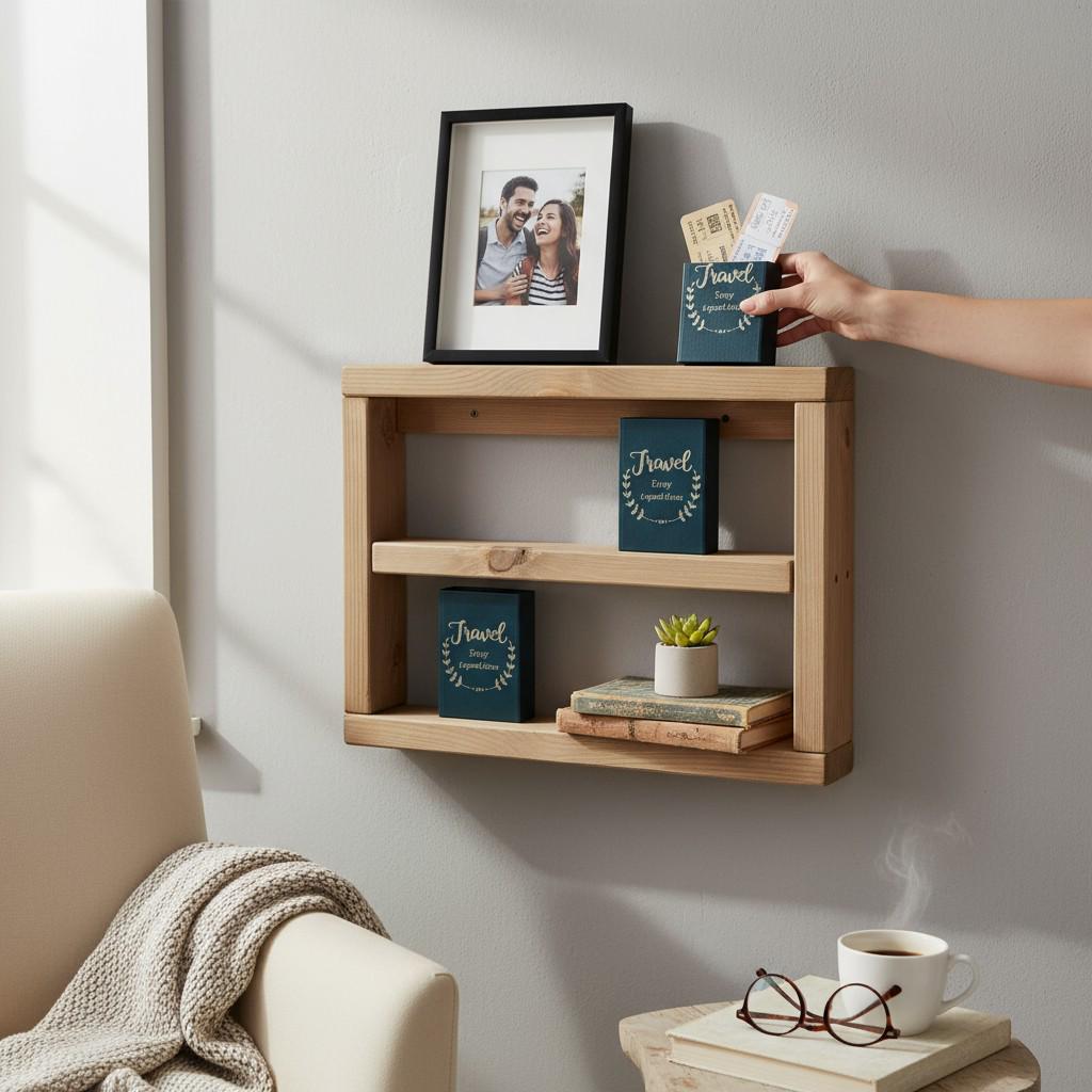 The shelf is finished in a warm oak brown tone using a water-based wood stain that enhances the natural grain and gives a cozy, natural look.