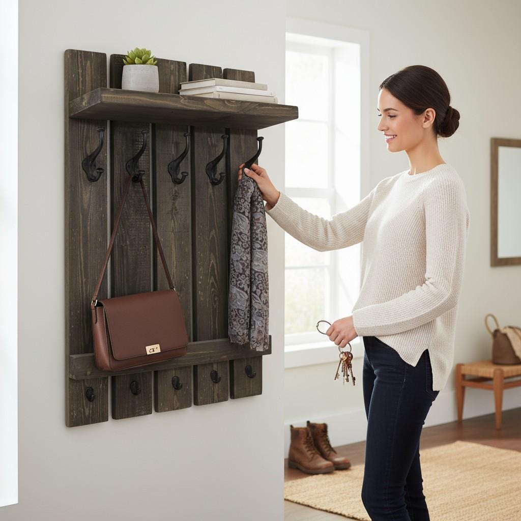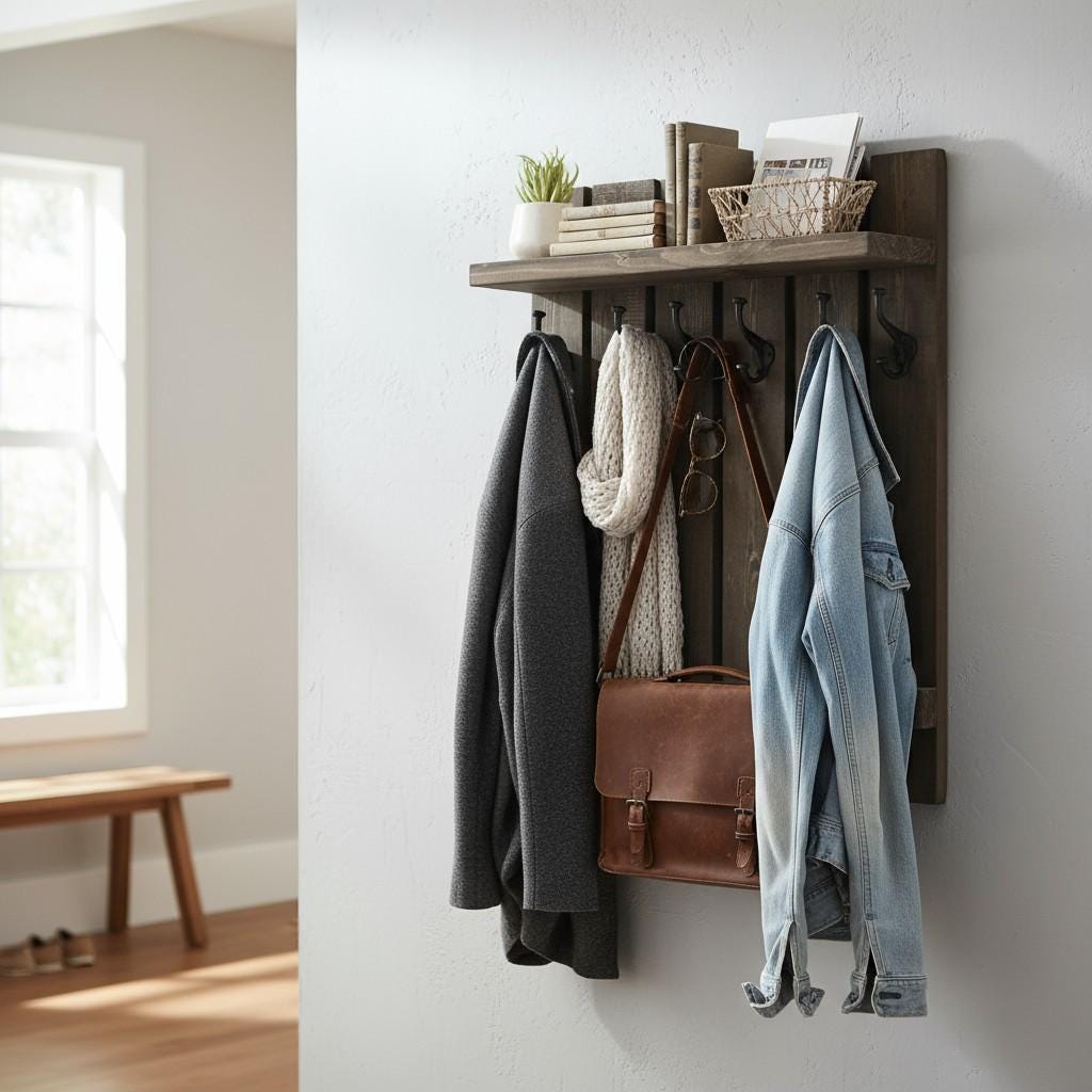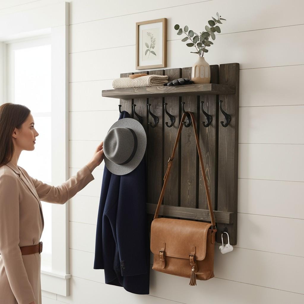 - A narrow hat shelf offers extra space for a few decorative elements