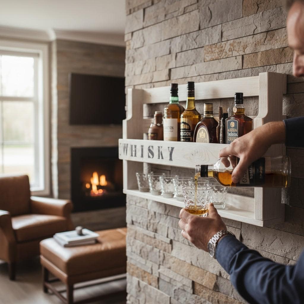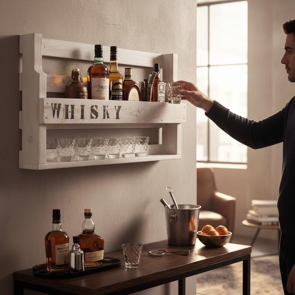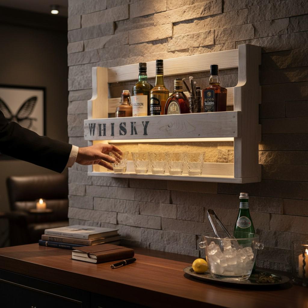 • Jedes Regal wird von Hand gesägt, geschliffen, gestrichen und mit dem Schriftzug WHISKY veredelt