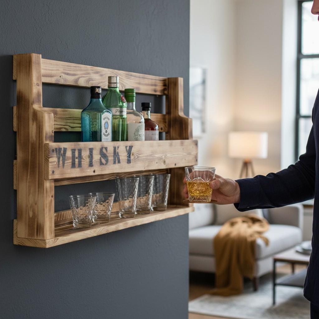- ein klassisches Whisky Regal aus Holz im angesagten Industrie-Lok für echte Wein und Whiskey Liebhaber
